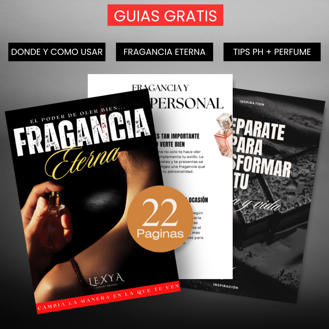 Adicional a eso recibiras 3 guias en forma de ebook, que son: 1 Fragancia Eterna: el poder de oler bien y cambiar la manera en que te ven, 1 guia de como y donde aplicar tu perfume correctamente y 1 guia de tips y hacks para mejorar la durabilidad de tu perfume teniendo en cuenta tu PH