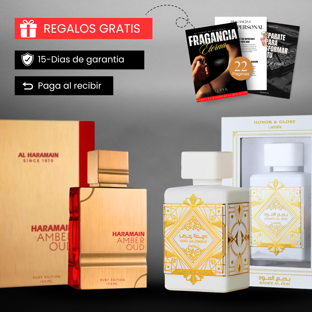 Recibiras 2 perfumes de 120ml que son 1 LATAFFA HONOR & GLORY y 1 HARAMAIN AMBER OUD ROUGE EDITION.